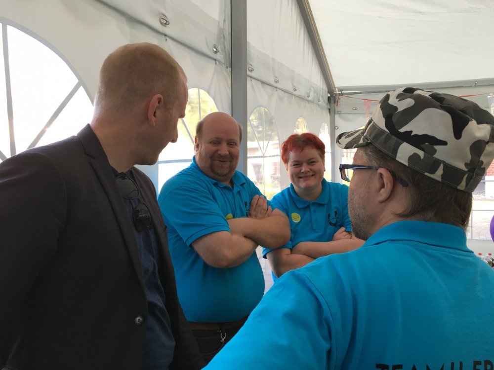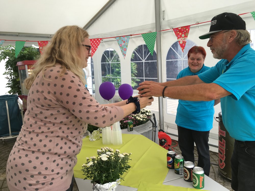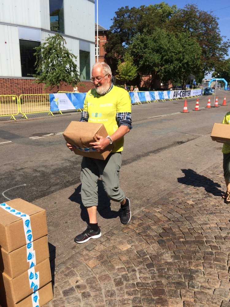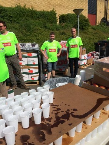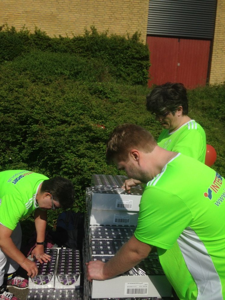 Conny, Lisbeth og Niels pakker drikkebrikker fra Rynkeby ud, så løberne kan få [...]slukket tørsten efter en 10 km