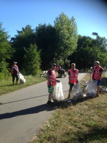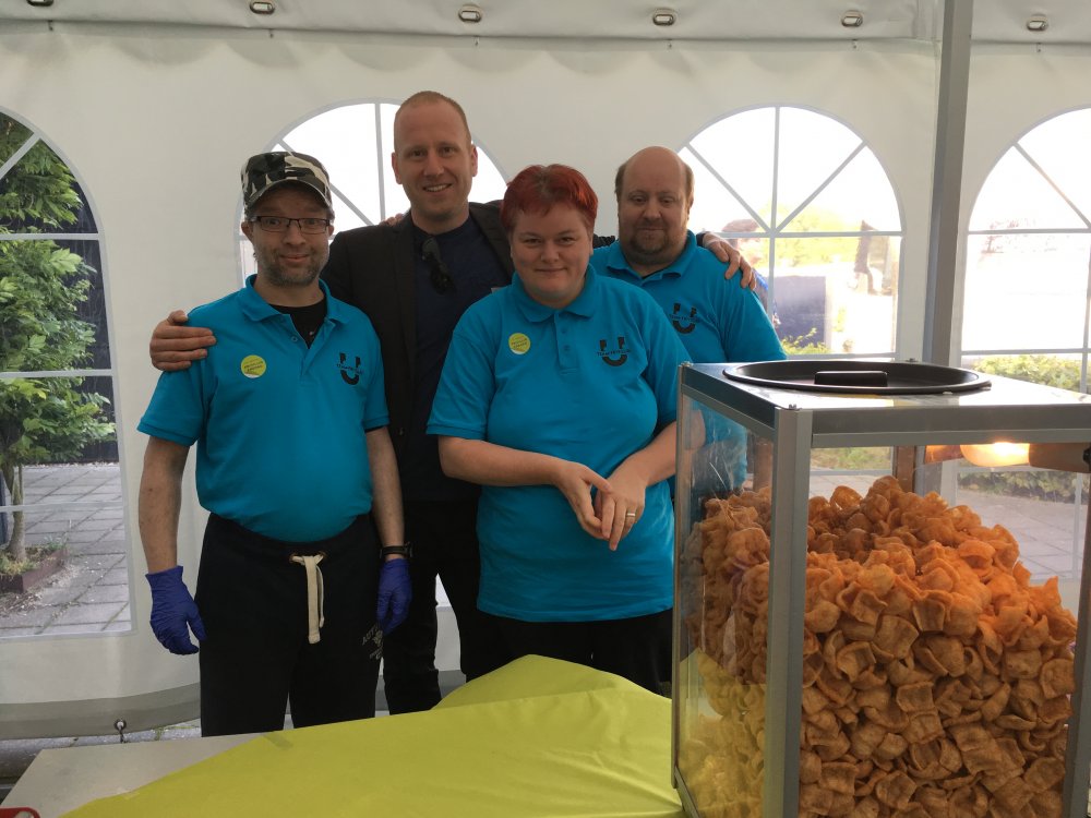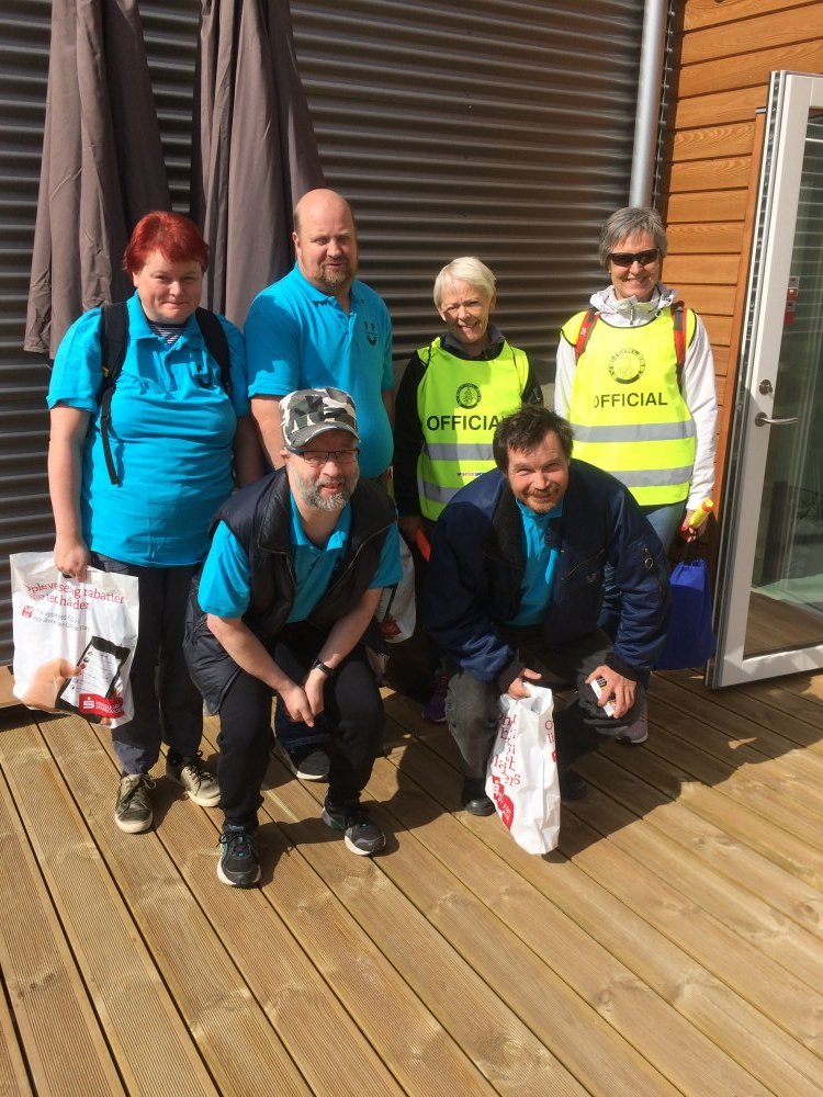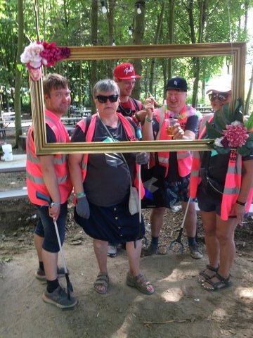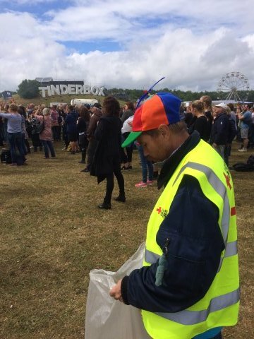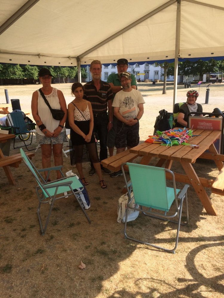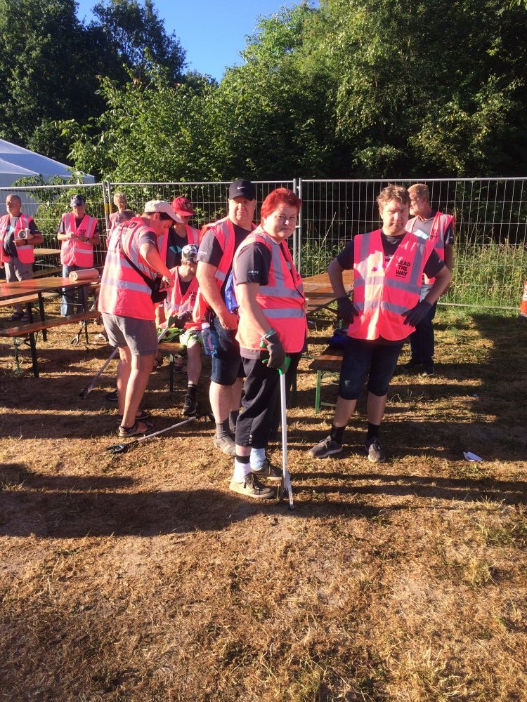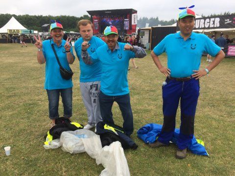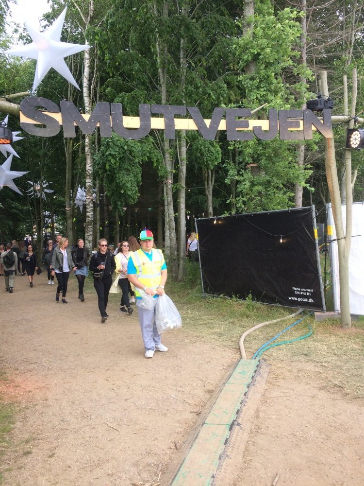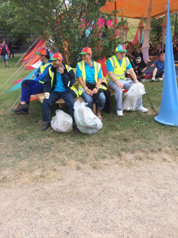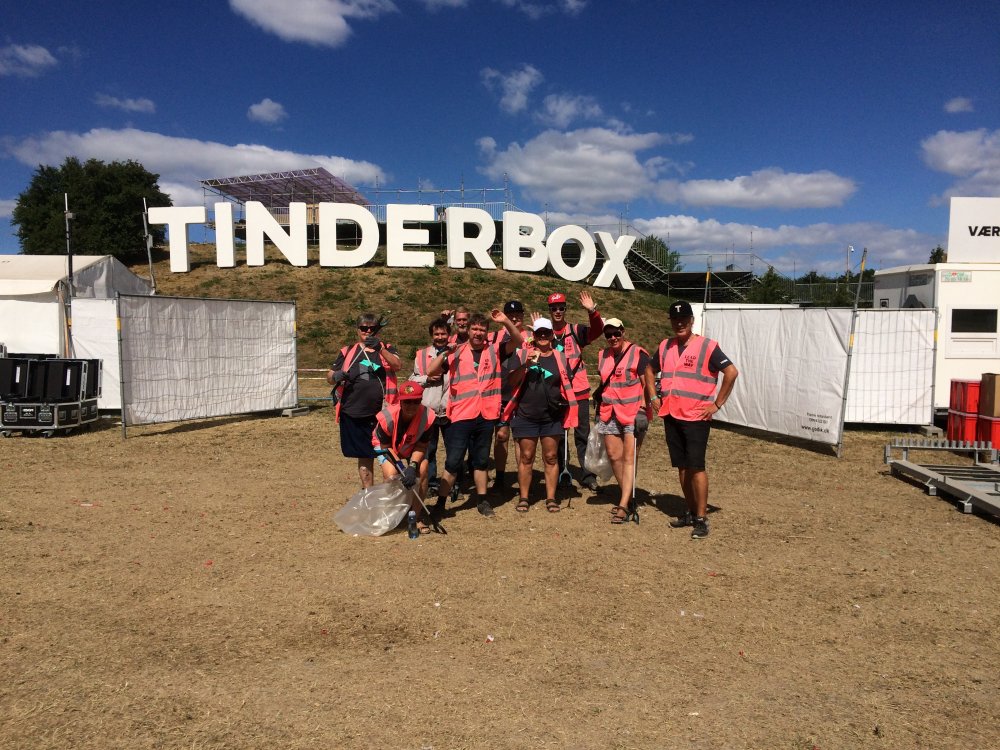 Team U-Frivillig klar til at samle pantflasker på Tinderbox. Fra venstre Lone, Jacob, Allan [...]og Nghia.