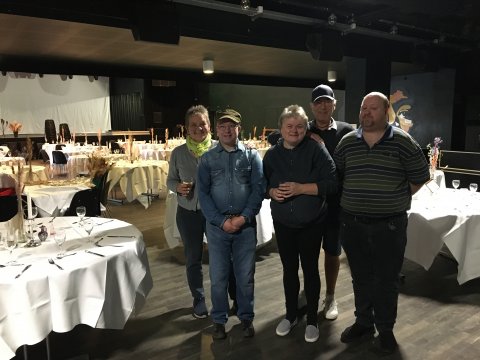 Borddækning med videre om formiddagen og Gallafest om aftenen på Posten. Lone, Robert, [...]Annika, PE og Brian er klar. FrivilligGalla 2021