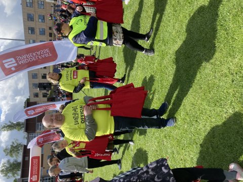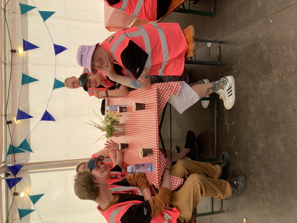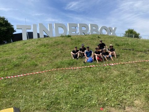 Endelig, endelig tilbage på Tinderbox. Flittige Team U-frivillig klar ved plænen foran hovedindgangen. [...]Tinderbox Festival 2022.